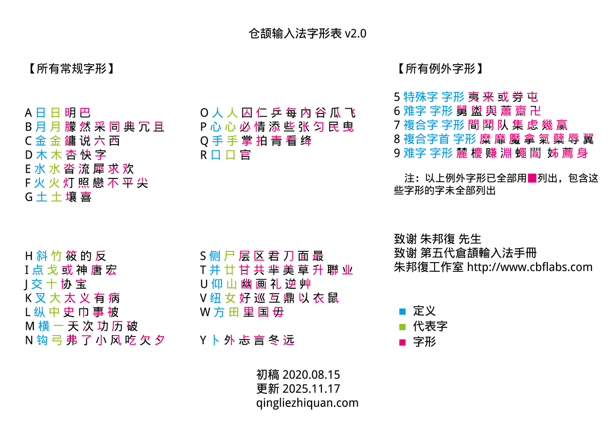 这份《仓颉输入法字形表v2.0》又可称之为《仓颉输入法部件图》。此字形,与常规意义上的“汉字的整个形状”不同,特指“汉字的部分形状”。