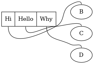 A [ | A [shape=record; label="{<r> Hi | <s> Hello | <t> Why }"] | ||