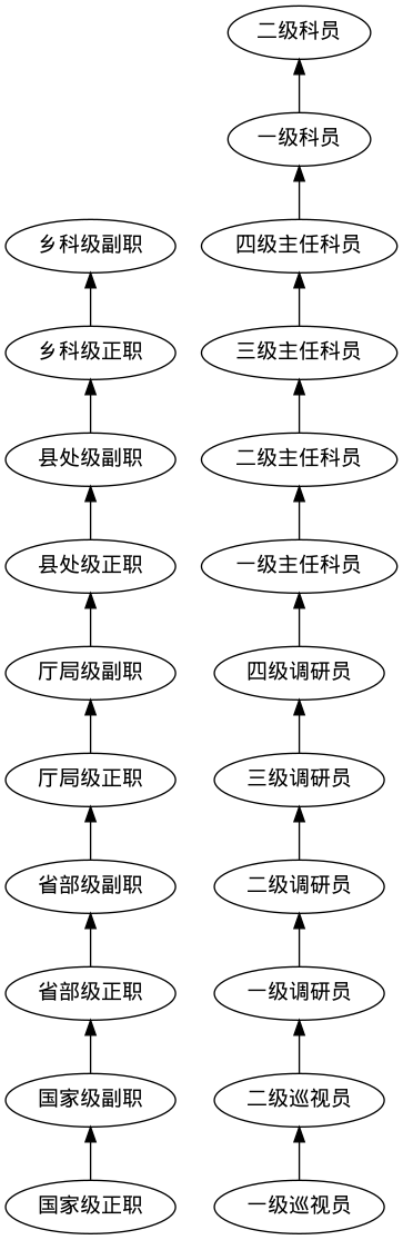 国家级正职 -> 国家级副职 -> 省部级正职 -> 省部级副职 -> 厅局级正职 -> 厅局级副职 -> 县处级正职 -> 县处级副职 -> 乡科级正职 -> 乡科级副职; | 国家级正职 -> 国家级副职 -> 省部级正职 -> 省部级副职 -> 厅局级正职 -> 厅局级副职 -> 县处级正职 -> 县处级副职 -> 乡科级正职 -> 乡科级副职; | ||